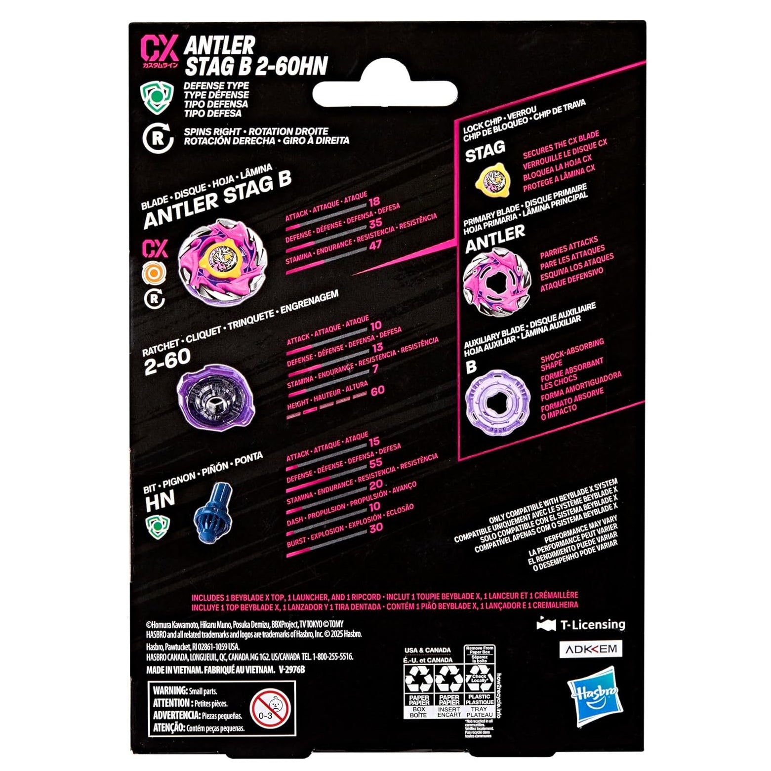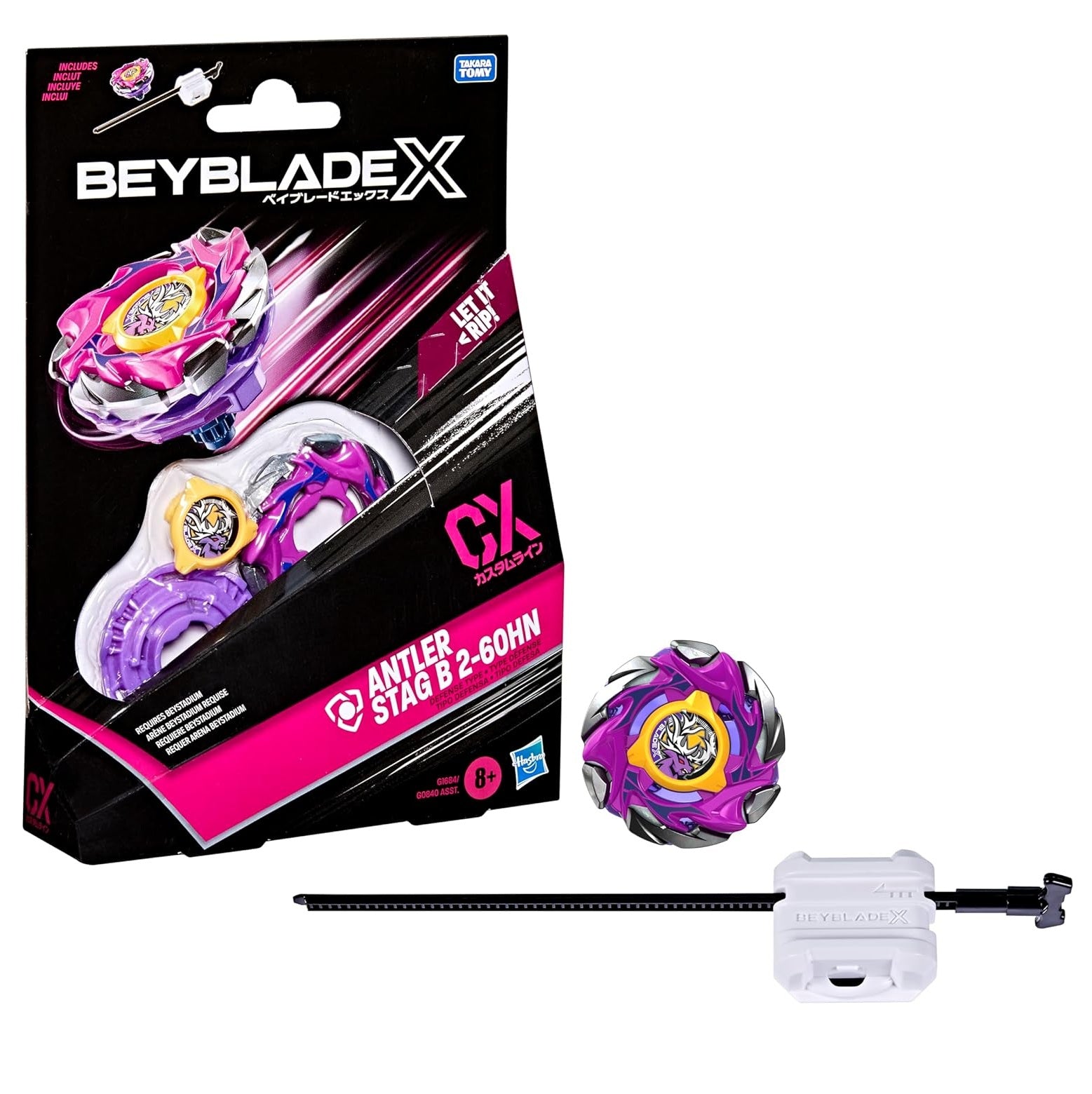 - ANTLER STAG B 2-60HN CX RIGHT-SPIN DEFENSE TYPE WITH STAMINA TYPE BLADE: Includes Takara Tomy-designed Beyblade X launcher and top with authentic die-cast metal parts