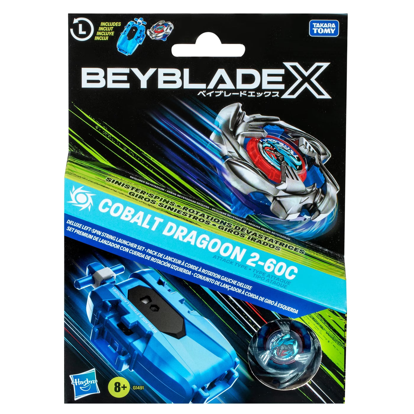 - Rise to new heights: The Cobalt Dragoon line starter design allows fast starts and provides double power without inserting a ripcord for every battle! This set includes 1 left turning Beyblade X line starter and 1 left-turning Beyblade X spinning top