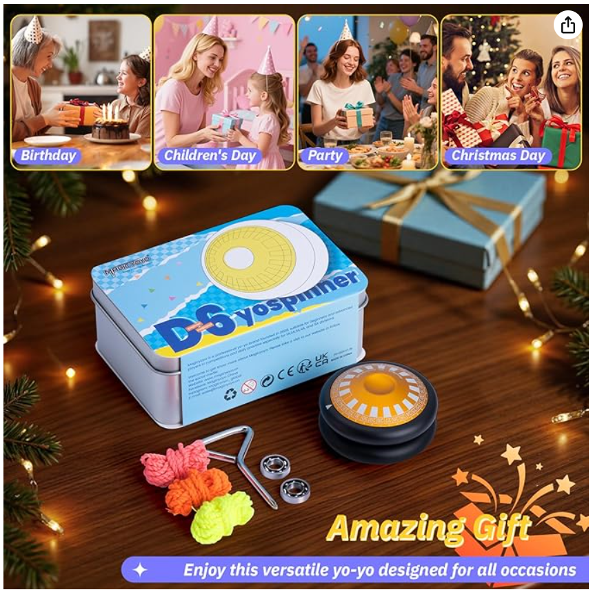 Free spinning caps on a classic looping shaped yoyo. Get the premium feel with the full metal design. The DNA has become effortless. Use it as a fidget spinner, spinning top, gyroscope, roulette wheel or a classic "looping" yoyo, its up to you!