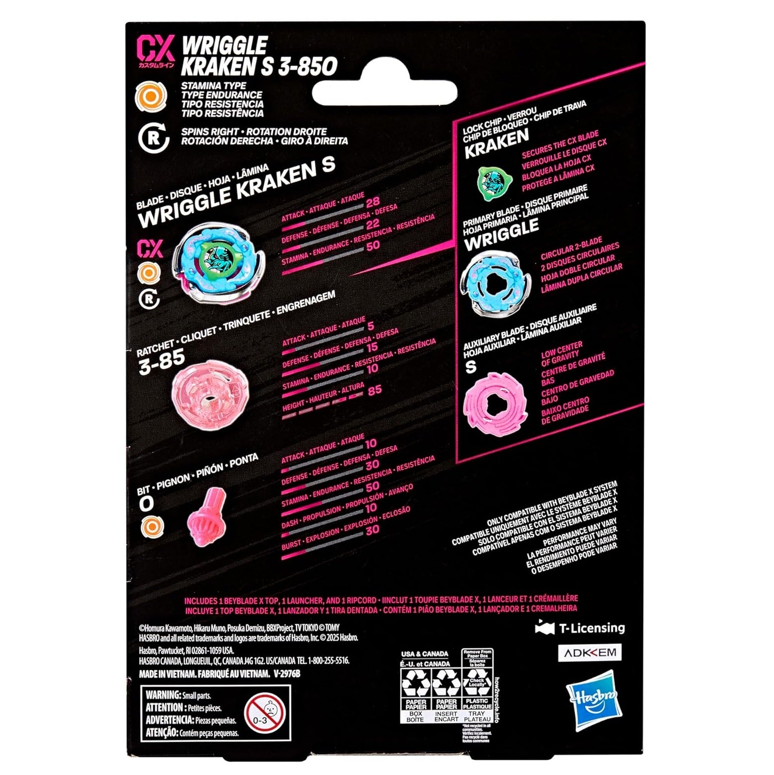 - WRIGGLE KRAKEN S 3-85O CX RIGHT-SPIN STAMINA TYPE WITH STAMINA TYPE BLADE: Includes Takara Tomy-designed Beyblade X launcher and top with authentic die-cast metal parts